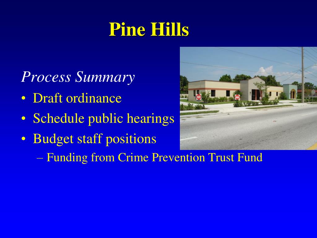 Pine Hills Process Summary • Draft ordinance • Schedule public hearings • Budget staff positions • Funding from Crime Prevention Trust Fund