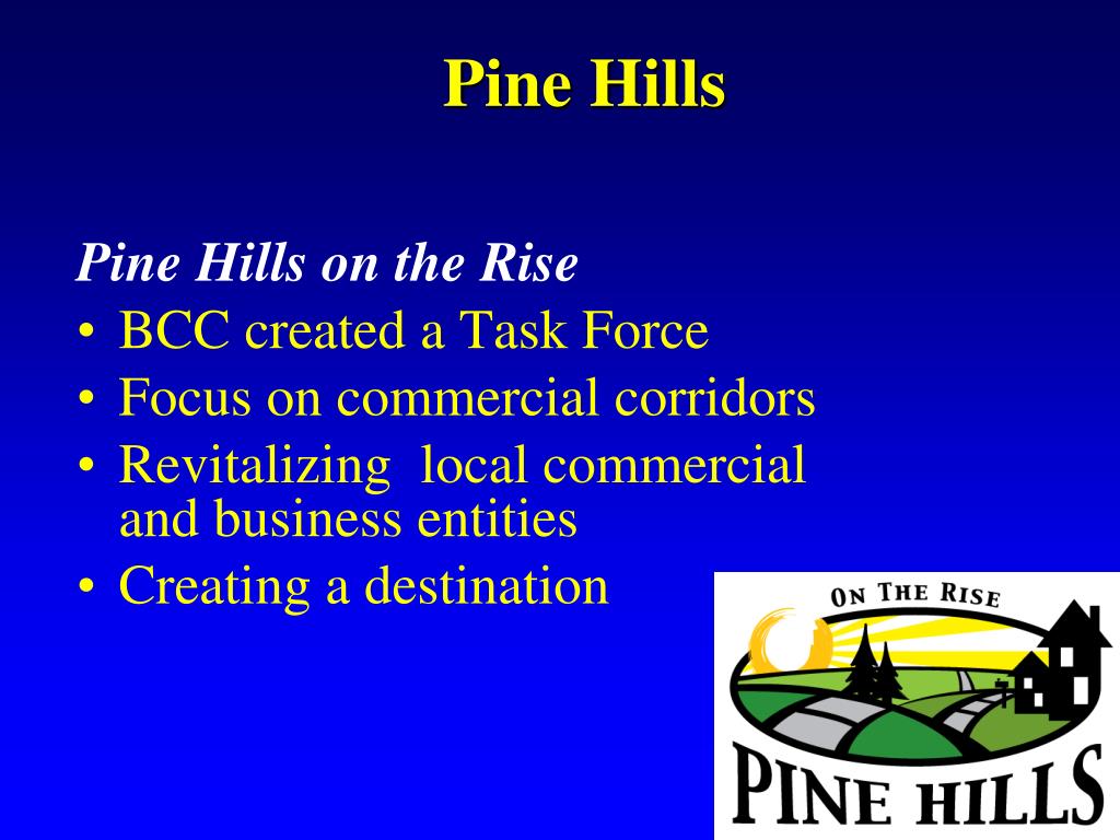 Pine Hills Pine Hills on the Rise • BCC created a Task Force • Focus on commercial corridors • Revitalizing local commercial and business entities • Creating a destination