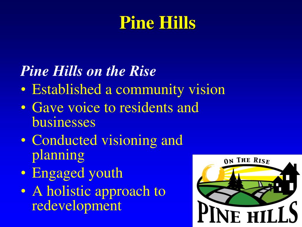 Pine Hills Pine Hills on the Rise • Established a community vision • Gave voice to residents and businesses • Conducted visioning and planning • Engaged youth • A holistic approach to redevelopment