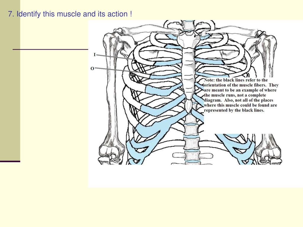 6. Identify this muscle and its action ! • Origin: Inferior border of rib • Insertion: Superior border of inferior rib • Action: Elevates ribs • Innervation: Intercostal nerves