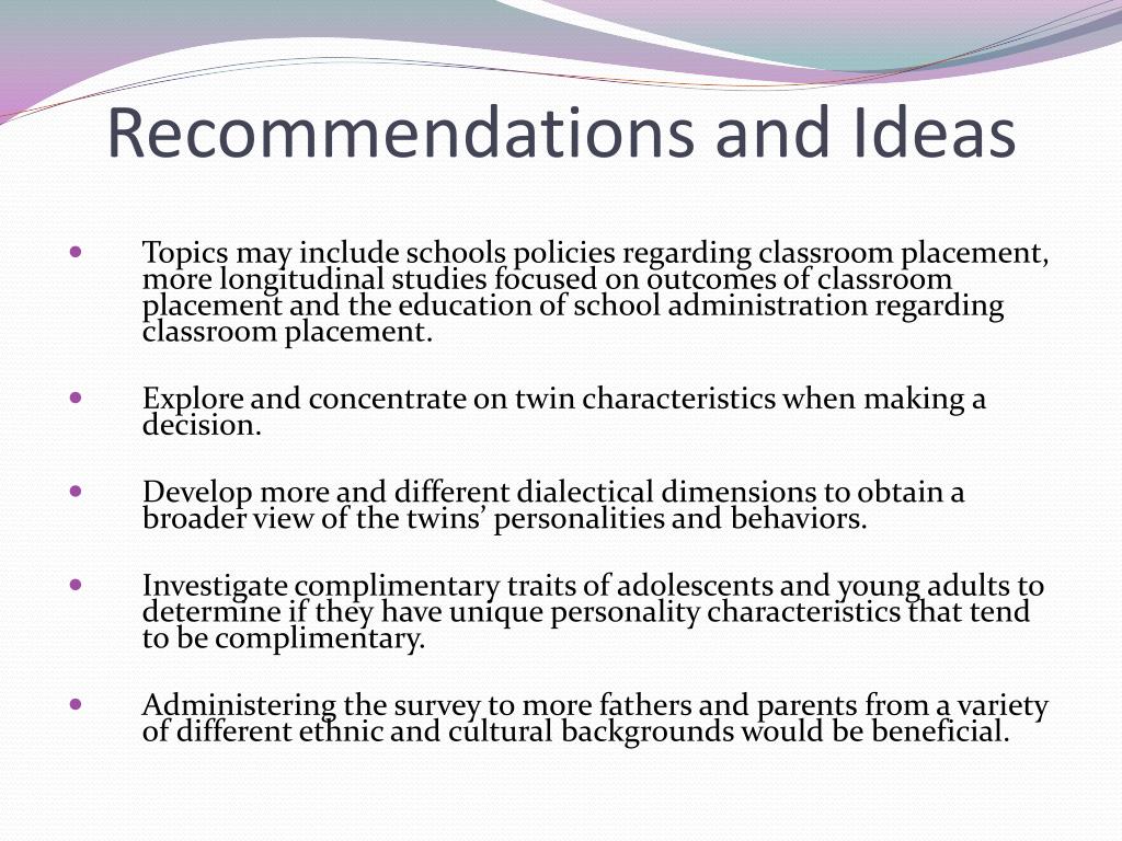 Recommendations and Ideas • Topics may include schools policies regarding classroom placement, more longitudinal studies focused on outcomes of classroom placement and the education of school administration regarding classroom placement. • Explore and concentrate on twin characteristics when making a decision. • Develop more and different dialectical dimensions to obtain a broader view of the twins’ personalities and behaviors. • Investigate complimentary traits of adolescents and young adults to determine if they have unique personality characteristics that tend to be complimentary. • Administering the survey to more fathers and parents from a variety of different ethnic and cultural backgrounds would be beneficial.