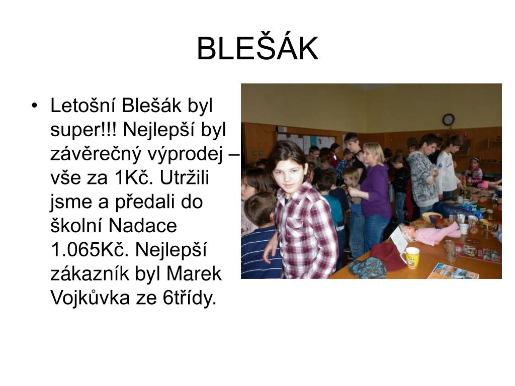 Letošní Blešák byl super!!! Nejlepší byl závěrečný výprodej – vše za 1Kč. Utržili jsme a předali do školní Nadace 1.065Kč. Nejlepší zákazník byl Marek Vojkůvka ze 6třídy. BLEŠÁK