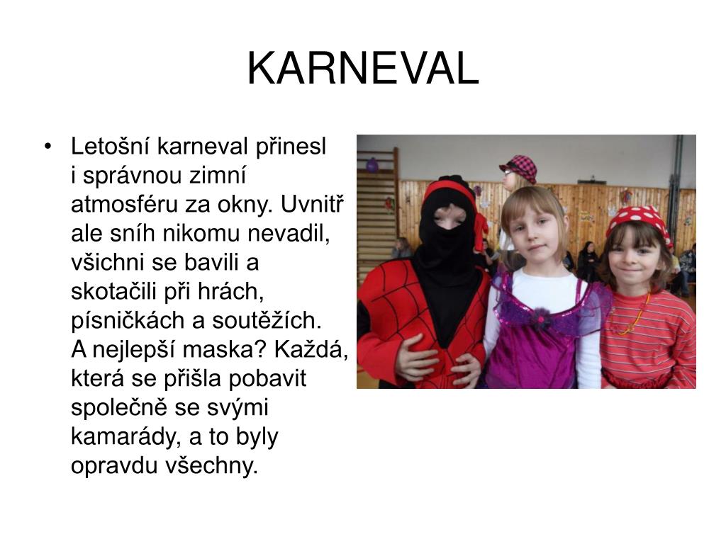 Letošní karneval přinesl i správnou zimní atmosféru za okny. Uvnitř ale sníh nikomu nevadil, všichni se bavili a skotačili při hrách, písničkách a soutěžích. A nejlepší maska? Každá, která se přišla pobavit společně se svými kamarády, a to byly opravdu všechny. KARNEVAL