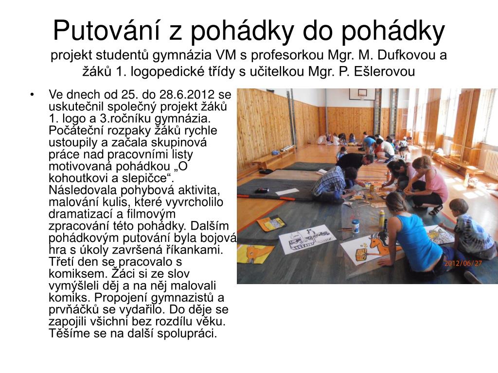 Ve dnech od 25. do 28.6.2012 se uskutečnil společný projekt žáků 1. logo a 3.ročníku gymnázia. Počáteční rozpaky žáků rychle ustoupily a začala skupinová práce nad pracovními listy motivovaná pohádkou „O kohoutkovi a slepičce“. Následovala pohybová aktivita, malování kulis, které vyvrcholilo dramatizací a filmovým zpracování této pohádky. Dalším pohádkovým putování byla bojová hra s úkoly završená říkankami. Třetí den se pracovalo s komiksem. Žáci si ze slov vymýšleli děj a na něj malovali komiks. Propojení gymnazistů a prvňáčků se vydařilo. Do děje se zapojili všichni bez rozdílu věku. Těšíme se na další spolupráci. Putování z pohádky do pohádkyprojekt studentů gymnázia VM s profesorkou Mgr. M. Dufkovou a žáků 1. logopedické třídy s učitelkou Mgr. P. Ešlerovou