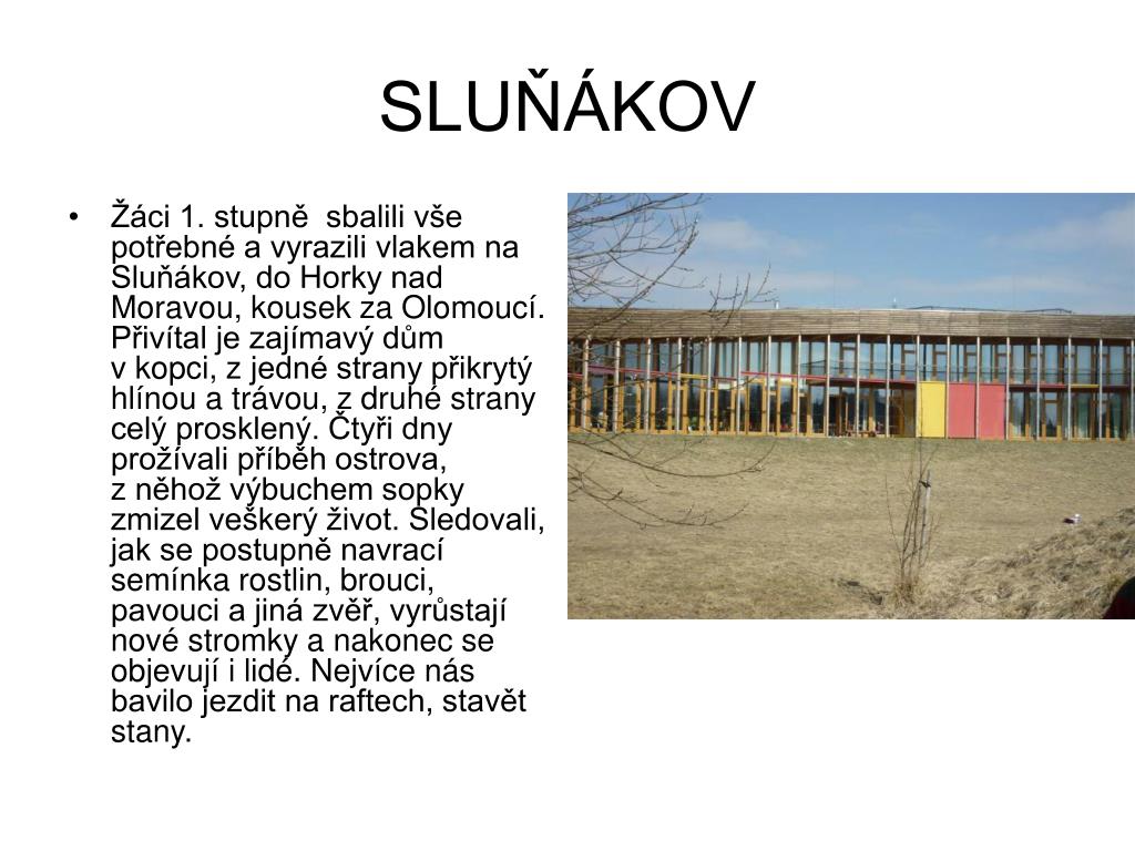 Žáci 1. stupně sbalili vše potřebné a vyrazili vlakem na Sluňákov, do Horky nad Moravou, kousek za Olomoucí. Přivítal je zajímavý dům v kopci, z jedné strany přikrytý hlínou a trávou, z druhé strany celý prosklený. Čtyři dny prožívali příběh ostrova, z něhož výbuchem sopky zmizel veškerý život. Sledovali, jak se postupně navrací semínka rostlin, brouci, pavouci a jiná zvěř, vyrůstají nové stromky a nakonec se objevují i lidé. Nejvíce nás bavilo jezdit na raftech, stavět stany. SLUŇÁKOV