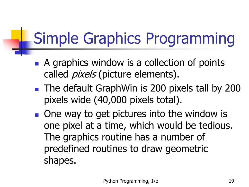 Simple Graphics Programming • A graphics window is a collection of points called pixels (picture elements). • The default GraphWin is 200 pixels tall by 200 pixels wide (40,000 pixels total). • One way to get pictures into the window is one pixel at a time, which would be tedious. The graphics routine has a number of predefined routines to draw geometric shapes. Python Programming, 1/e