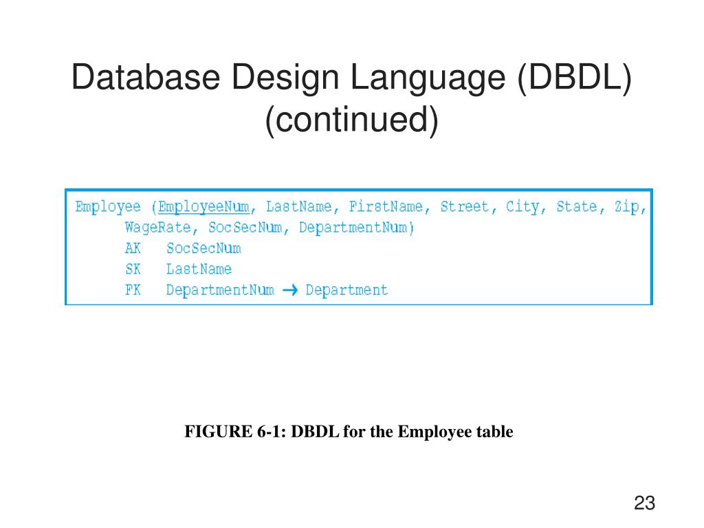 Database Design Language (DBDL) (continued) FIGURE 6-1: DBDL for the Employee table