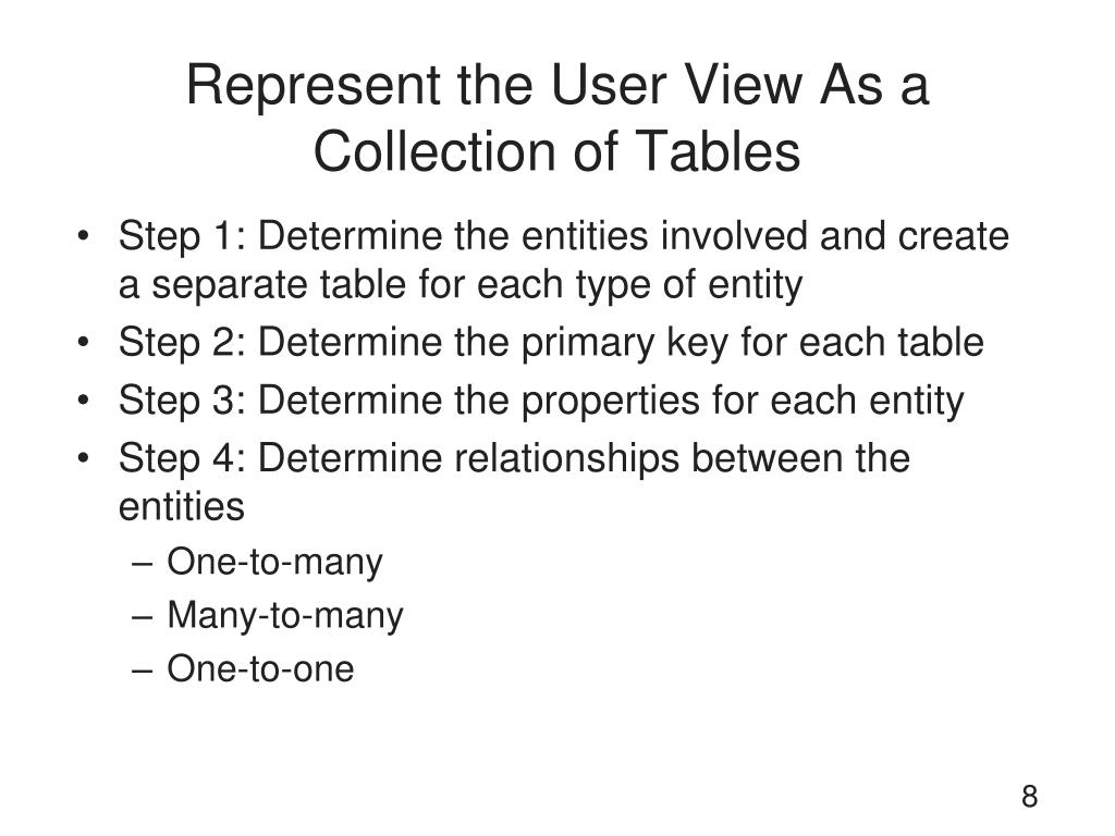 Represent the User View As a Collection of Tables • Step 1: Determine the entities involved and create a separate table for each type of entity • Step 2: Determine the primary key for each table • Step 3: Determine the properties for each entity • Step 4: Determine relationships between the entities • One-to-many • Many-to-many • One-to-one
