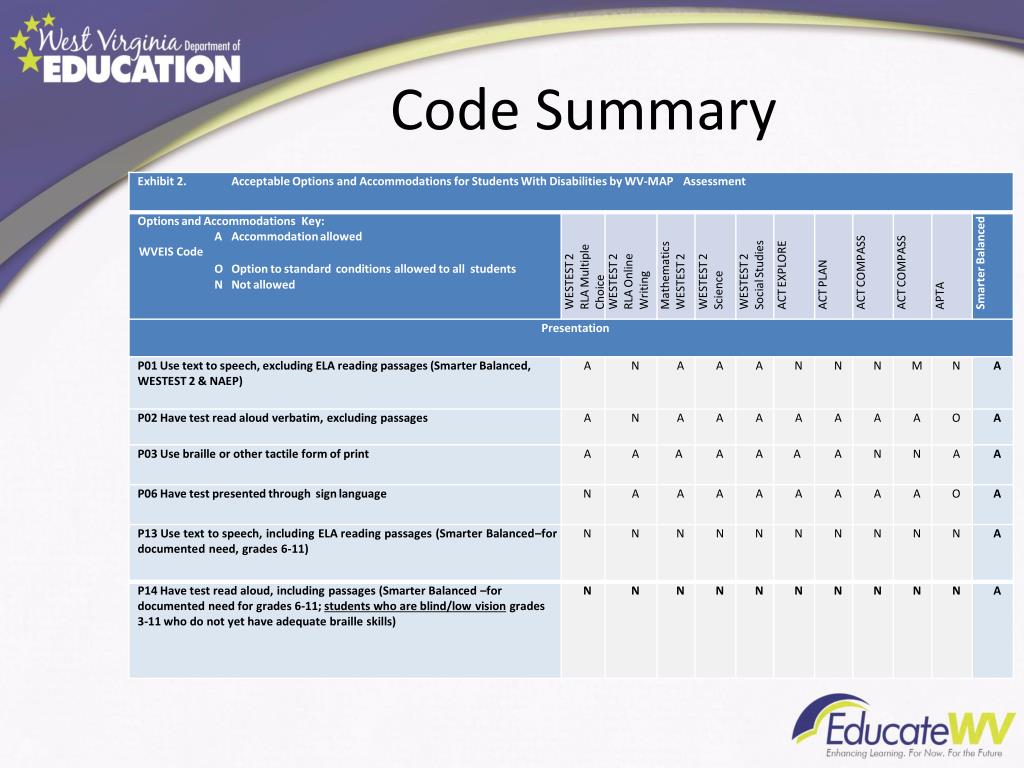 Smarter Balanced • P03 Use contracted braille or tactile graphics (All WV-MAP tests excluding NAEP computer-based) • P23Use a magnifying device to enlarge assessment material • P28 Use high contrast on screen (Smarter Balanced, WESTEST 2 and Online Writing, ACT COMPASS,NAEP, and other computer based assessments) • P33 Turn off any universal tools (Smarter Balanced) • P34 Use embedded American Sign Language (Smarter Balanced – for ELA listening and math items only ) • P35 Use non-contracted braille and tactile graphics (Smarter Balanced) • P36 Use closed captioning (Smarter Balanced – for ELA listening and NAEP) • P37 Use masking (Smarter Balanced)