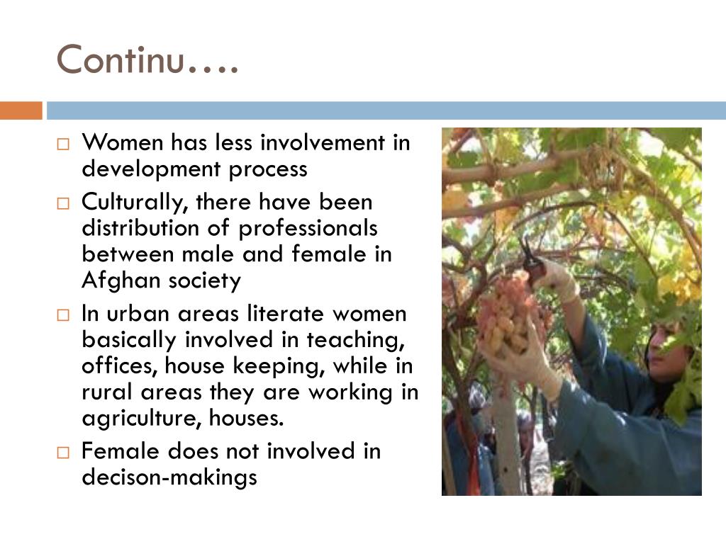 Continu…. • Women has less involvement in development process • Culturally, there have been distribution of professionals between male and female in Afghan society • In urban areas literate women basically involved in teaching, offices, house keeping, while in rural areas they are working in agriculture, houses. • Female does not involved in decison-makings