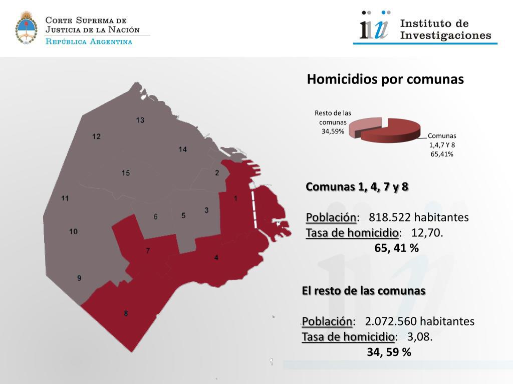 Comunas 1, 4, 7 y 8 Población: 818.522 habitantes Tasa de homicidio: 12,70. 65, 41 % El resto de las comunas Población: 2.072.560 habitantes Tasa de homicidio: 3,08. 34, 59 %
