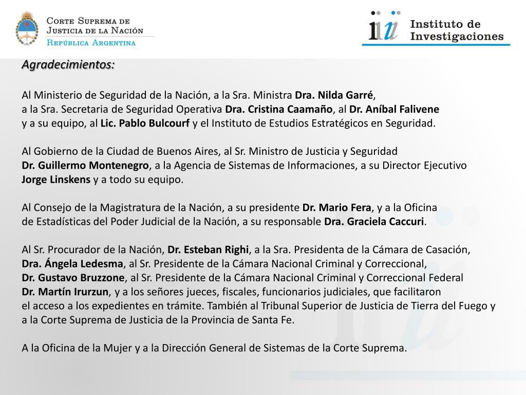 Agradecimientos: Al Ministerio de Seguridad de la Nación, a la Sra. Ministra Dra. Nilda Garré, a la Sra. Secretaria de Seguridad Operativa Dra. Cristina Caamaño, al Dr. Aníbal Falivene y a su equipo, al Lic. Pablo Bulcourfy el Instituto de Estudios Estratégicos en Seguridad. Al Gobierno de la Ciudad de Buenos Aires, al Sr. Ministro de Justicia y Seguridad Dr. Guillermo Montenegro, a la Agencia de Sistemas de Informaciones, a su Director Ejecutivo Jorge Linskensy a todo su equipo. Al Consejo de la Magistratura de la Nación, a su presidente Dr. Mario Fera, y a la Oficina de Estadísticas del Poder Judicial de la Nación, a su responsable Dra. Graciela Caccuri. Al Sr. Procurador de la Nación, Dr. Esteban Righi, a la Sra. Presidenta de la Cámara de Casación, Dra. Ángela Ledesma, al Sr. Presidente de la Cámara Nacional Criminal y Correccional, Dr. Gustavo Bruzzone, al Sr. Presidente de la Cámara Nacional Criminal y Correccional Federal Dr. Martín Irurzun, y a los señores jueces, fiscales, funcionarios judiciales, que facilitaron el acceso a los expedientes en trámite. También al Tribunal Superior de Justicia de Tierra del Fuego y a la Corte Suprema de Justicia de la Provincia de Santa Fe. A la Oficina de la Mujer y a la Dirección General de Sistemas de la Corte Suprema.