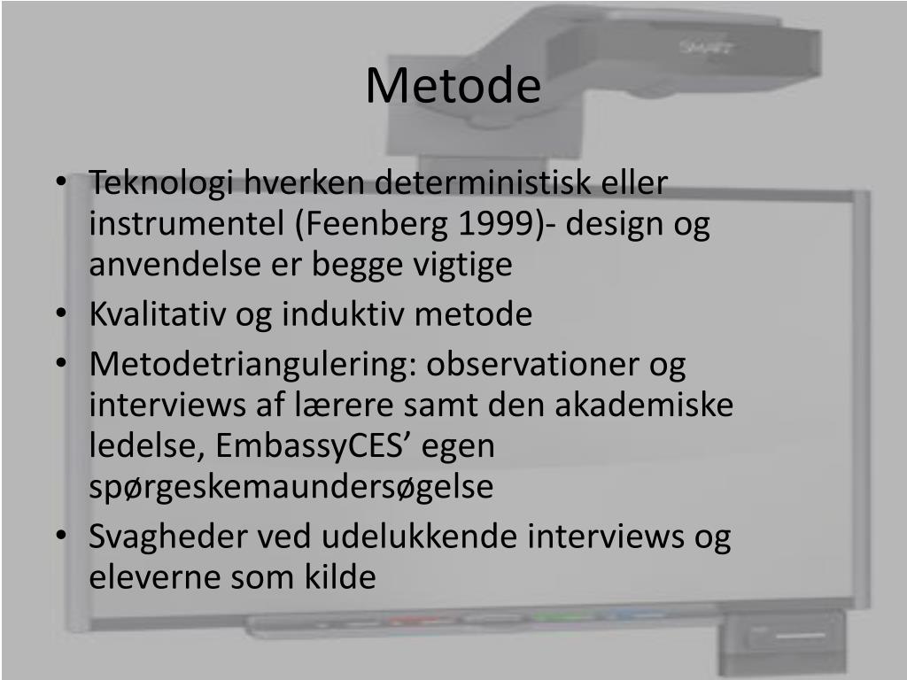 Metode • Teknologi hverken deterministisk eller instrumentel (Feenberg 1999)- design og anvendelse er begge vigtige • Kvalitativ og induktiv metode • Metodetriangulering: observationer og interviews af lærere samt den akademiske ledelse, EmbassyCES’ egen spørgeskemaundersøgelse • Svagheder ved udelukkende interviews og eleverne som kilde