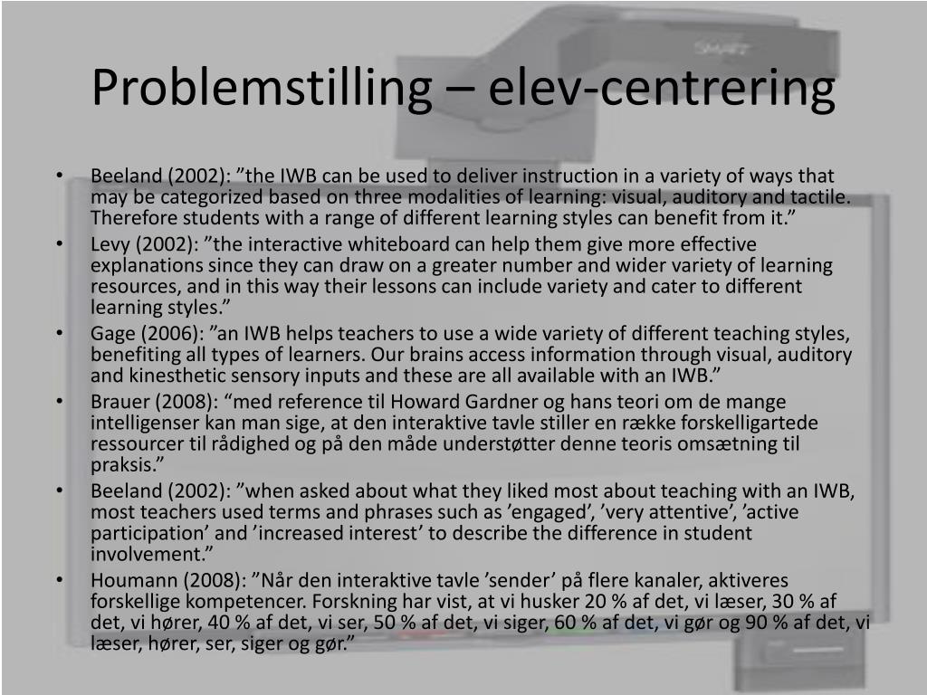 Problemstilling – elev-centrering • Beeland (2002): ”the IWB can be used to deliver instruction in a variety of ways that may be categorized based on three modalities of learning: visual, auditory and tactile. Therefore students with a range of different learning styles can benefit from it.” • Levy (2002): ”the interactive whiteboard can help them give more effective explanations since they can draw on a greater number and wider variety of learning resources, and in this way their lessons can include variety and cater to different learning styles.” • Gage (2006): ”an IWB helps teachers to use a wide variety of different teaching styles, benefiting all types of learners. Our brains access information through visual, auditory and kinesthetic sensory inputs and these are all available with an IWB.” • Brauer (2008): “med reference til Howard Gardner og hans teori om de mange intelligenser kan man sige, at den interaktive tavle stiller en række forskelligartede ressourcer til rådighed og på den måde understøtter denne teoris omsætning til praksis.” • Beeland (2002): ”when asked about what they liked most about teaching with an IWB, most teachers used terms and phrases such as ’engaged’, ’very attentive’, ’active participation’ and ’increased interest’ to describe the difference in student involvement.” • Houmann (2008): ”Når den interaktive tavle ’sender’ på flere kanaler, aktiveres forskellige kompetencer. Forskning har vist, at vi husker 20 % af det, vi læser, 30 % af det, vi hører, 40 % af det, vi ser, 50 % af det, vi siger, 60 % af det, vi gør og 90 % af det, vi læser, hører, ser, siger og gør.”