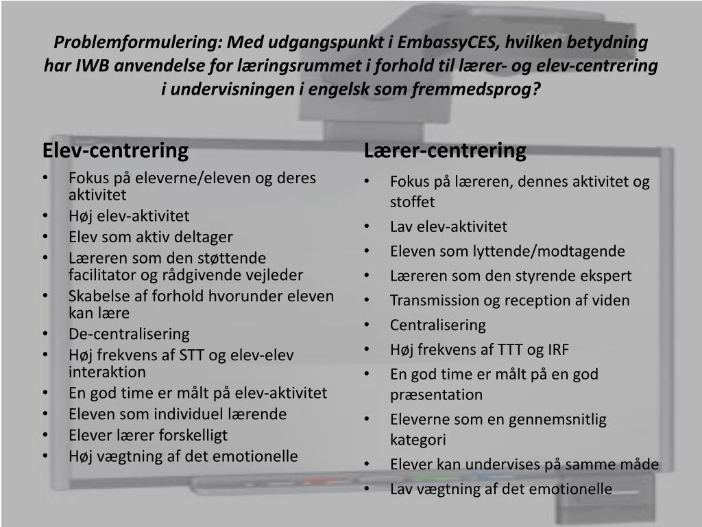 Problemformulering: Med udgangspunkt i EmbassyCES, hvilken betydning har IWB anvendelse for læringsrummet i forhold til lærer- og elev-centrering i undervisningen i engelsk som fremmedsprog? Elev-centrering Lærer-centrering Fokus på læreren, dennes aktivitet og stoffet Lav elev-aktivitet Eleven som lyttende/modtagende Læreren som den styrende ekspert Transmission og reception af viden Centralisering Høj frekvens af TTT og IRF En god time er målt på en god præsentation Eleverne som en gennemsnitlig kategori Elever kan undervises på samme måde Lav vægtning af det emotionelle • Fokus på eleverne/eleven og deres aktivitet • Høj elev-aktivitet • Elev som aktiv deltager • Læreren som den støttende facilitator og rådgivende vejleder • Skabelse af forhold hvorunder eleven kan lære • De-centralisering • Høj frekvens af STT og elev-elev interaktion • En god time er målt på elev-aktivitet • Eleven som individuel lærende • Elever lærer forskelligt • Høj vægtning af det emotionelle