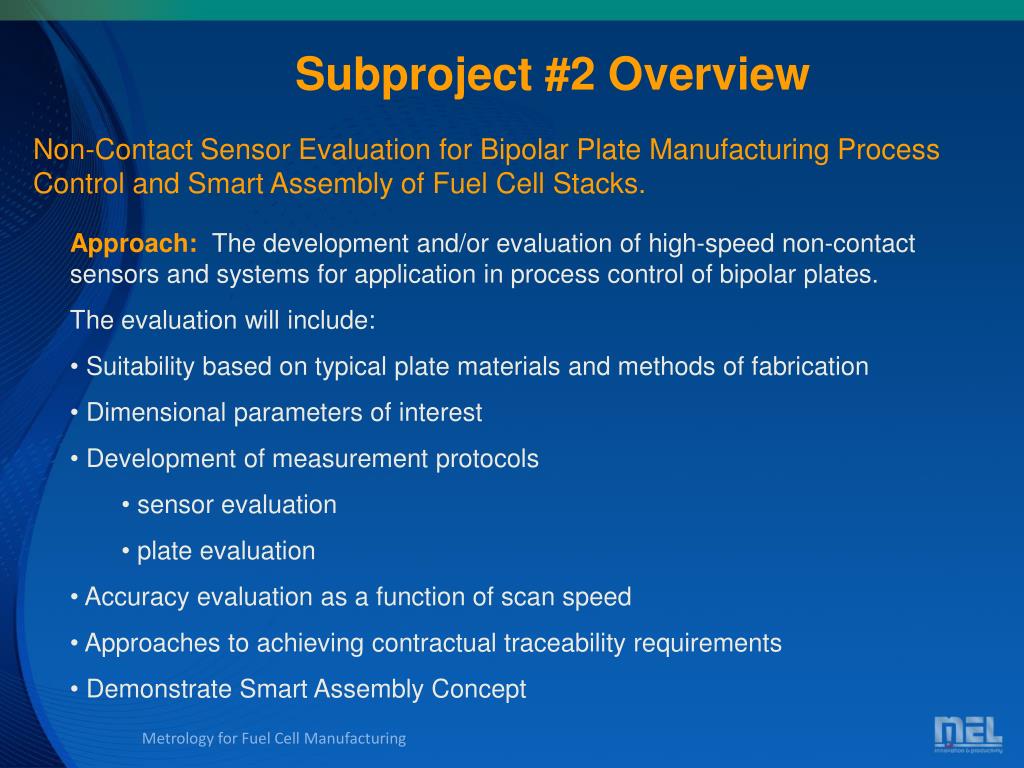 Subproject #2 Overview Non-Contact Sensor Evaluation for Bipolar Plate Manufacturing Process Control and Smart Assembly of Fuel Cell Stacks. • Approach:The development and/or evaluation of high-speed non-contact sensors and systems for application in process control of bipolar plates. • The evaluation will include: • Suitability based on typical plate materials and methods of fabrication • Dimensional parameters of interest • Development of measurement protocols • sensor evaluation • plate evaluation • Accuracy evaluation as a function of scan speed • Approaches to achieving contractual traceability requirements • Demonstrate Smart Assembly Concept