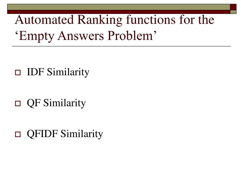 Automated Ranking functions for the ‘Empty Answers Problem’ • IDF Similarity • QF Similarity • QFIDF Similarity