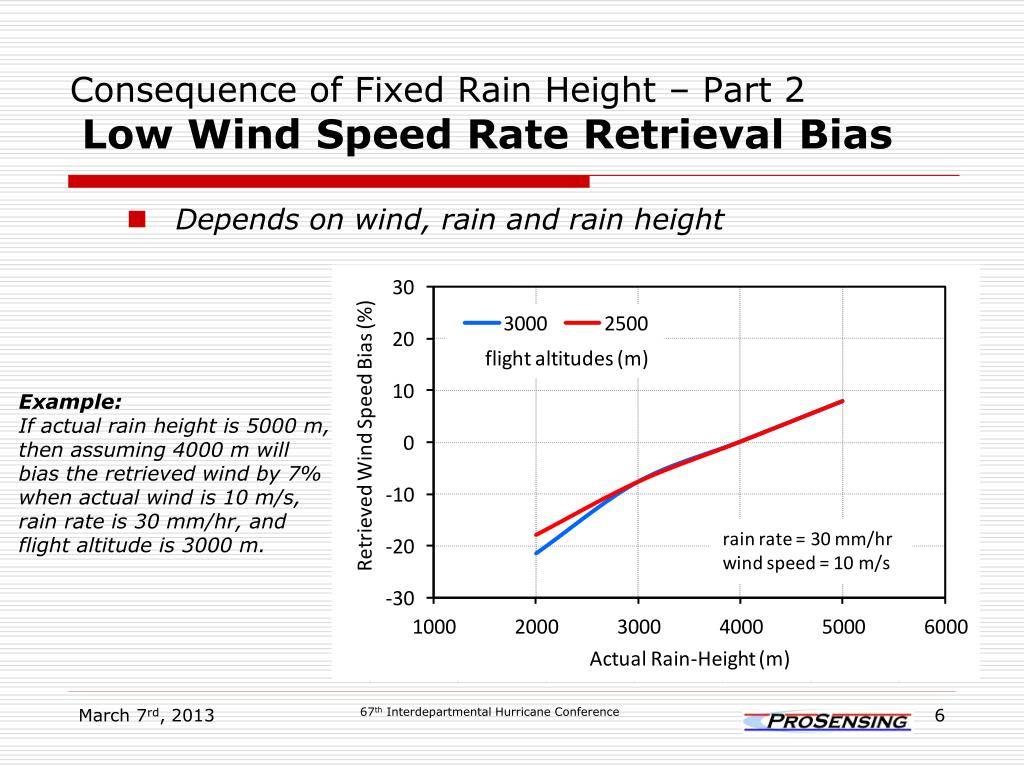 Consequence of fixed Rain Height – Part 1Rain Rate Retrieval Bias • Depends on rain height but not wind and rain Example: If actual rain height is 5000 m, then assuming 4000 m will bias the retrieved rain rate by 8% when flight altitude is 3000 m. • Calculated using the current SFMR measurement model 67th Interdepartmental Hurricane Conference