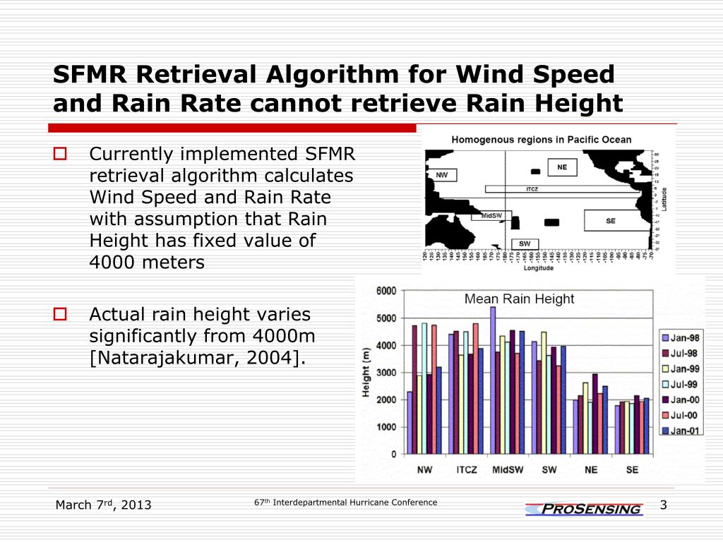 SFMR Retrieval Algorithm for Wind Speed and Rain Rate cannot retrieve Rain Height • Currently implemented SFMR retrieval algorithm calculates Wind Speed and Rain Rate with assumption that Rain Height has fixed value of 4000 meters • Actual rain height varies significantly from 4000m [Natarajakumar, 2004]. 67th Interdepartmental Hurricane Conference