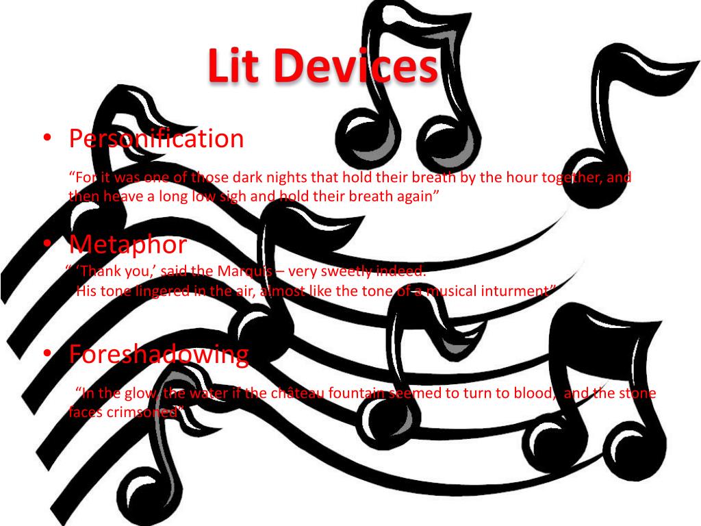 Lit Devices • Personification “For it was one of those dark nights that hold their breath by the hour together, and then heave a long low sigh and hold their breath again” • Metaphor “‘Thank you,’ said the Marquis – very sweetly indeed. His tone lingered in the air, almost like the tone of a musical inturment” • Foreshadowing “In the glow, the water if the château fountain seemed to turn to blood, and the stone faces crimsoned”