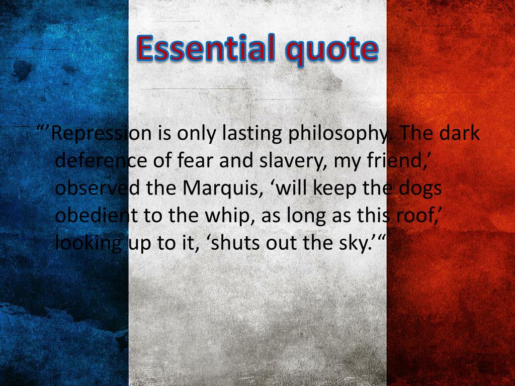 Essential quote “’Repression is only lasting philosophy. The dark deference of fear and slavery, my friend,’ observed the Marquis, ‘will keep the dogs obedient to the whip, as long as this roof,’ looking up to it, ‘shuts out the sky.’“