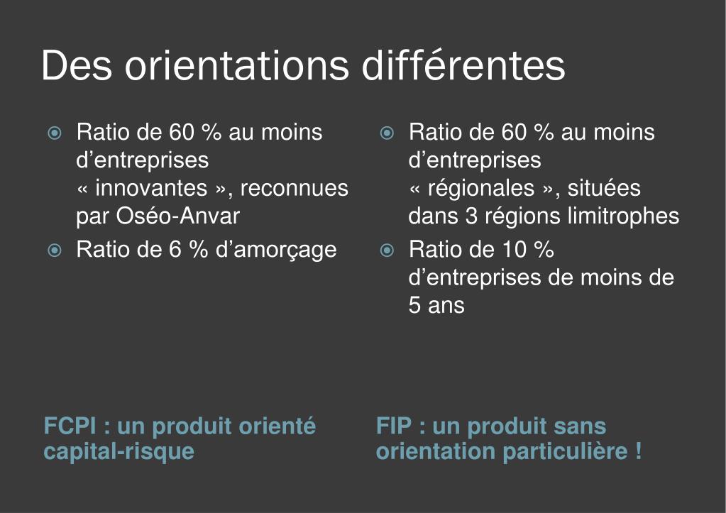 Des orientations différentes • Ratio de 60 % au moins d’entreprises « innovantes », reconnues par Oséo-Anvar • Ratio de 6 % d’amorçage • Ratio de 60 % au moins d’entreprises « régionales », situées dans 3 régions limitrophes • Ratio de 10 % d’entreprises de moins de 5 ans FCPI : un produit orienté capital-risque FIP : un produit sans orientation particulière !