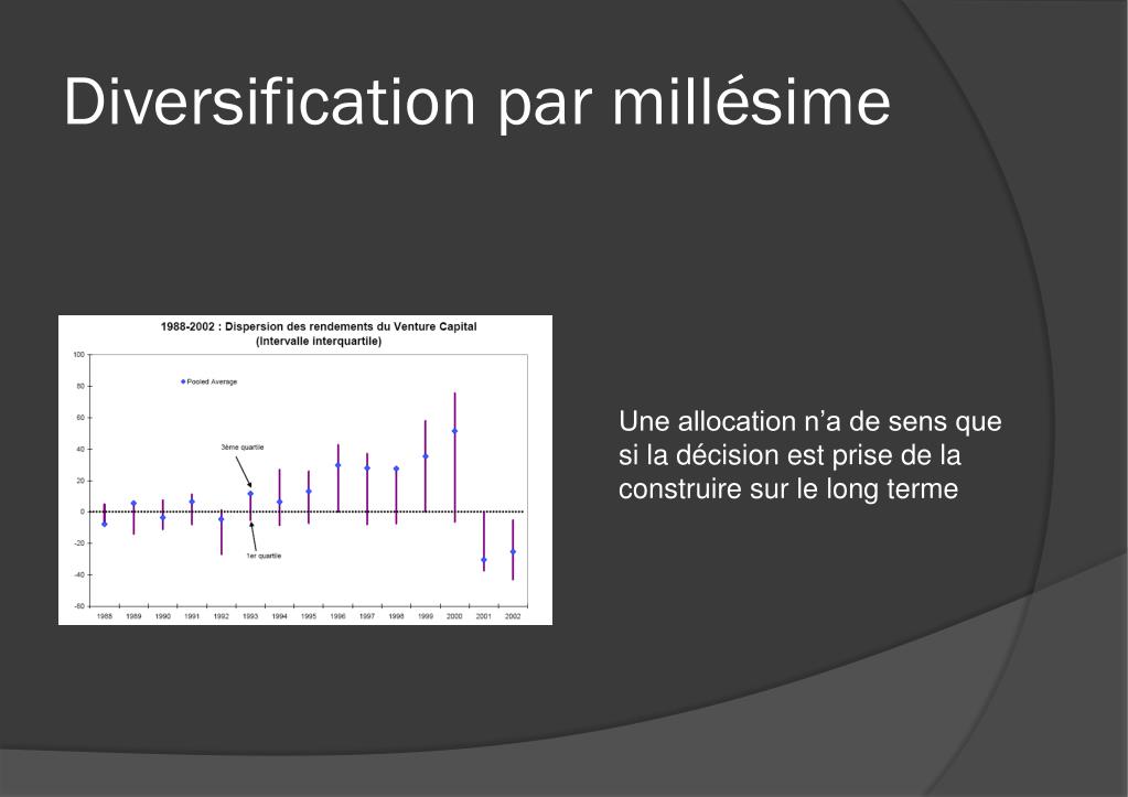 Résoudre ces difficultés • Commencer petit, mais diversifié • Le capital-risque n’est pas le bon point de départ • Intérêt des fonds émergents • notamment avec des équipes reconnues • Réfléchir en termes d’allocation globale • Ne surtout pas rentrer « juste pour un coup » • Fonds de fonds