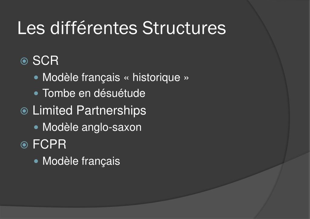 Les différentes Structures • SCR • Modèle français « historique » • Tombe en désuétude • Limited Partnerships • Modèle anglo-saxon • FCPR • Modèle français