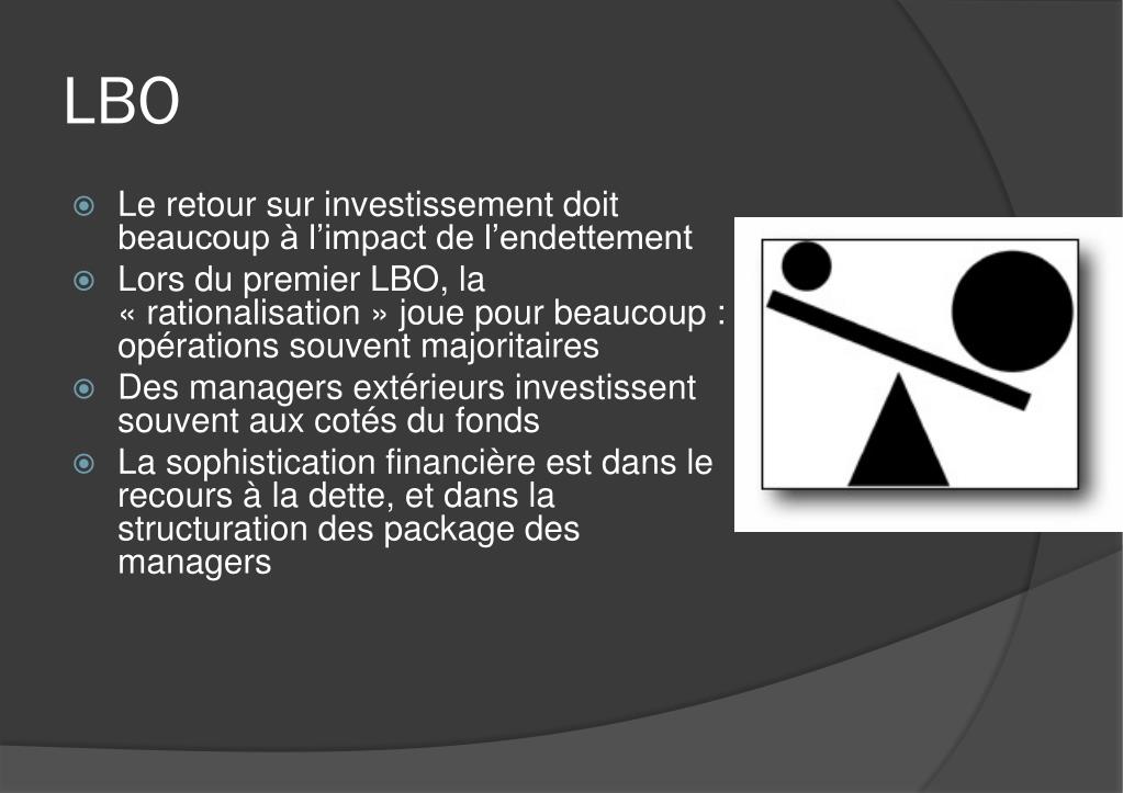 LBO • Le retour sur investissement doit beaucoup à l’impact de l’endettement • Lors du premier LBO, la « rationalisation » joue pour beaucoup : opérations souvent majoritaires • Des managers extérieurs investissent souvent aux cotés du fonds • La sophistication financière est dans le recours à la dette, et dans la structuration des package des managers