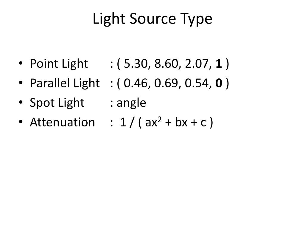 Light Source Type • Point Light : ( 5.30, 8.60, 2.07, 1 ) • Parallel Light : ( 0.46, 0.69, 0.54, 0 ) • Spot Light : angle • Attenuation : 1 / ( ax2 + bx + c )