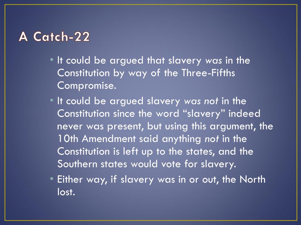 A Catch-22 • It could be argued that slavery was in the Constitution by way of the Three-Fifths Compromise. • It could be argued slavery was not in the Constitution since the word “slavery” indeed never was present, but using this argument, the 10th Amendment said anything not in the Constitution is left up to the states, and the Southern states would vote for slavery. • Either way, if slavery was in or out, the North lost.