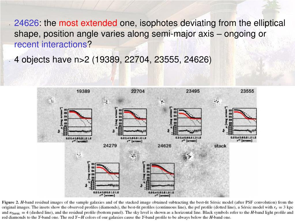 24626: the most extended one, isophotes deviating from the elliptical shape, position angle varies along semi-major axis – ongoing or recent interactions? • 4 objects have n>2 (19389, 22704, 23555, 24626)