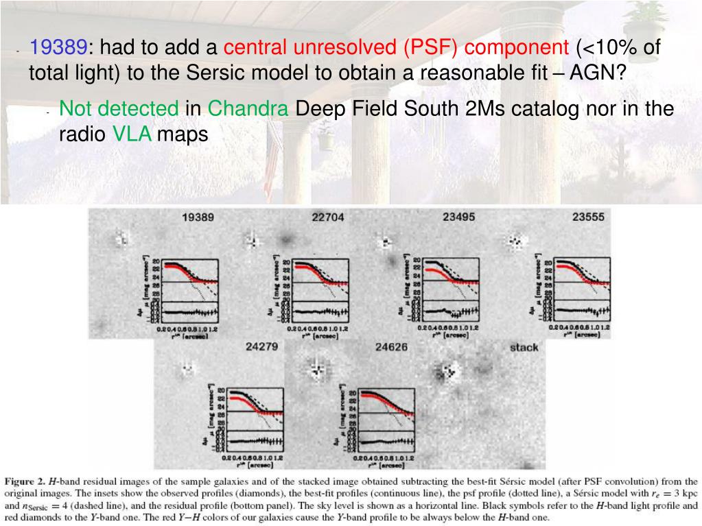 19389: had to add a central unresolved (PSF) component (<10% of total light) to the Sersic model to obtain a reasonable fit – AGN? • Not detected in Chandra Deep Field South 2Ms catalog nor in the radio VLA maps