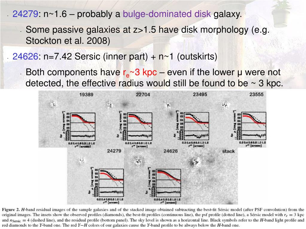 24279: n~1.6 – probably a bulge-dominated disk galaxy. • Some passive galaxies at z>1.5 have disk morphology (e.g. Stockton et al. 2008) • 24626: n=7.42 Sersic (inner part) + n~1 (outskirts) • Both components have re~3 kpc – even if the lower μ were not detected, the effective radius would still be found to be ~ 3 kpc.