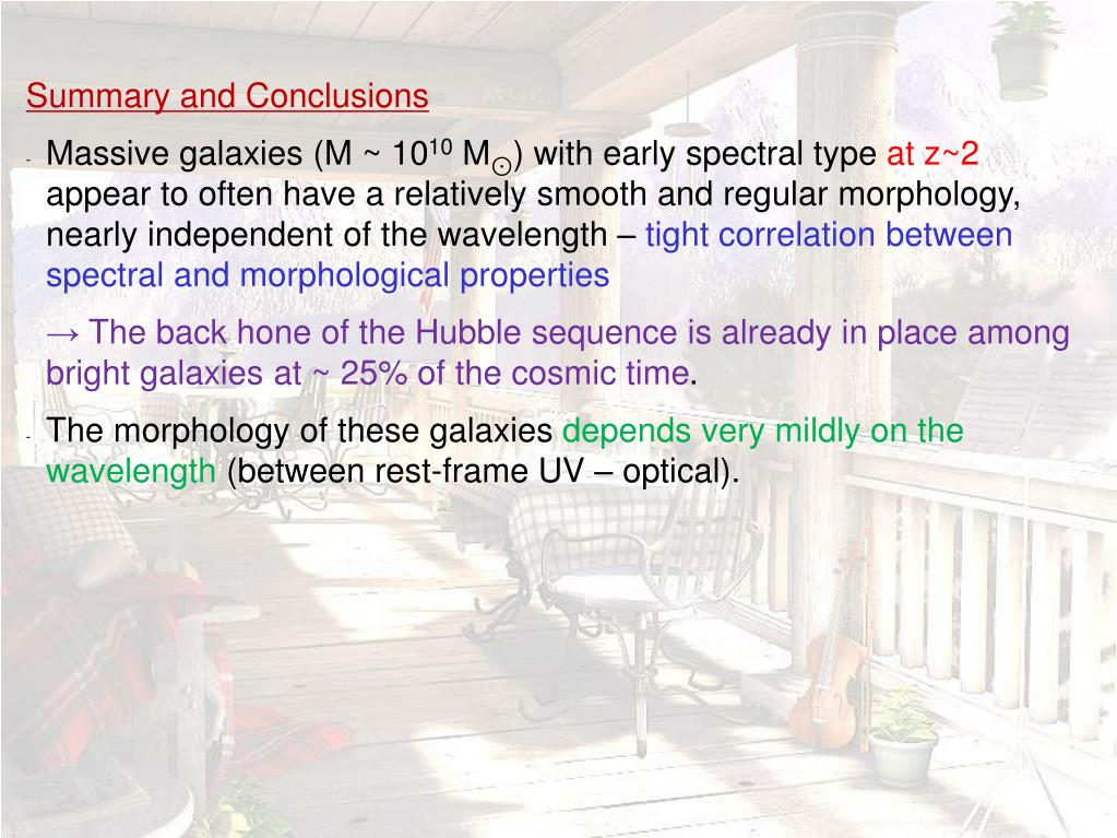 Summary and Conclusions • Massive galaxies (M ~ 1010 M⊙) with early spectral type at z~2 appear to often have a relatively smooth and regular morphology, nearly independent of the wavelength – tight correlation between spectral and morphological properties • → The back hone of the Hubble sequence is already in place among bright galaxies at ~ 25% of the cosmic time. • The morphology of these galaxies depends very mildly on the wavelength (between rest-frame UV – optical).