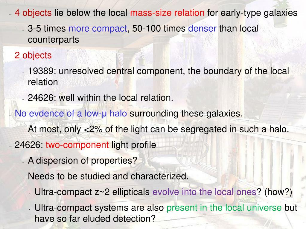 4 objects lie below the local mass-size relation for early-type galaxies • 3-5 times more compact, 50-100 times denser than local counterparts • 2 objects • 19389: unresolved central component, the boundary of the local relation • 24626: well within the local relation. • No evdence of a low-μ halo surrounding these galaxies. • At most, only <2% of the light can be segregated in such a halo. • 24626: two-component light profile • A dispersion of properties? • Needs to be studied and characterized. • Ultra-compact z~2 ellipticals evolve into the local ones? (how?) • Ultra-compact systems are also present in the local universe but have so far eluded detection?