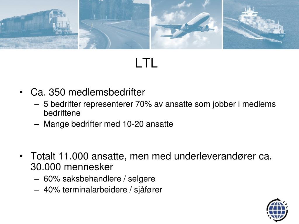 LTL • Ca. 350 medlemsbedrifter • 5 bedrifter representerer 70% av ansatte som jobber i medlems bedriftene • Mange bedrifter med 10-20 ansatte • Totalt 11.000 ansatte, men med underleverandører ca. 30.000 mennesker • 60% saksbehandlere / selgere • 40% terminalarbeidere / sjåfører