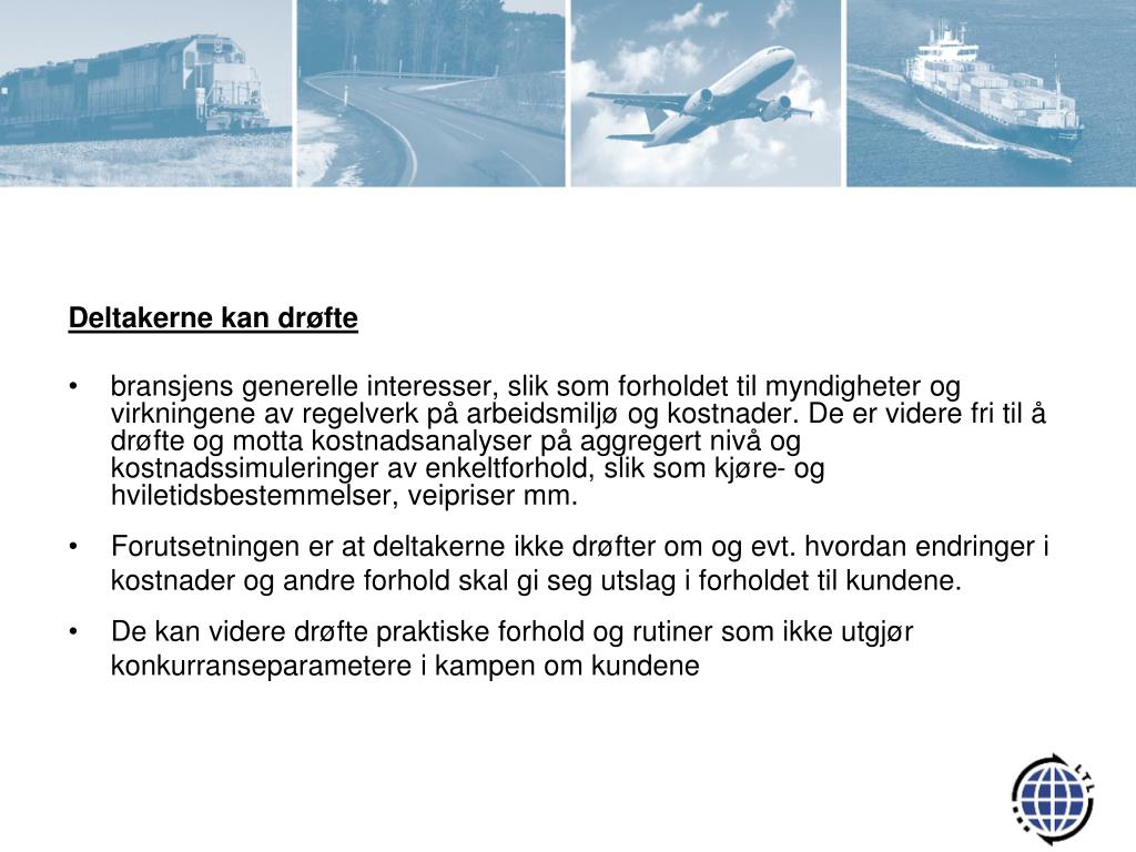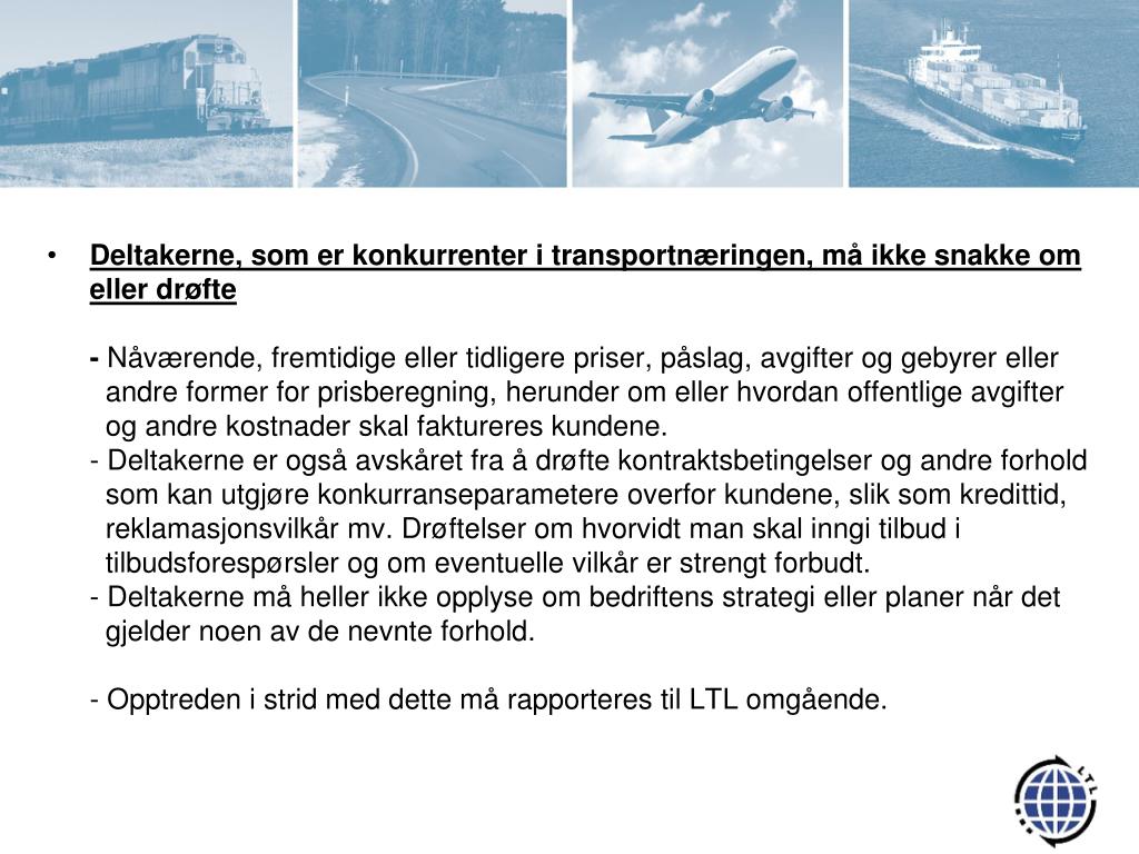 Deltakerne, som er konkurrenter i transportnæringen, må ikke snakke om eller drøfte - Nåværende, fremtidige eller tidligere priser, påslag, avgifter og gebyrer eller andre former for prisberegning, herunder om eller hvordan offentlige avgifter og andre kostnader skal faktureres kundene. - Deltakerne er også avskåret fra å drøfte kontraktsbetingelser og andre forhold som kan utgjøre konkurranseparametere overfor kundene, slik som kredittid, reklamasjonsvilkår mv. Drøftelser om hvorvidt man skal inngi tilbud i tilbudsforespørsler og om eventuelle vilkår er strengt forbudt. - Deltakerne må heller ikke opplyse om bedriftens strategi eller planer når det gjelder noen av de nevnte forhold.- Opptreden i strid med dette må rapporteres til LTL omgående.