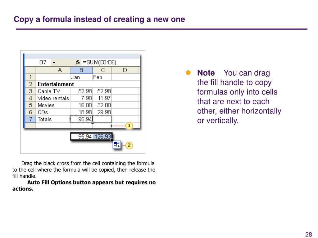 Copy a formula instead of creating a new one • Note You can drag the fill handle to copy formulas only into cells that are next to each other, either horizontally or vertically. Drag the black cross from the cell containing the formula to the cell where the formula will be copied, then release the fill handle. Auto Fill Options button appears but requires no actions.