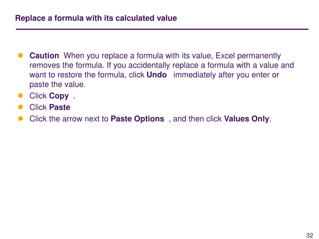 Replace a formula with its calculated value • Caution When you replace a formula with its value, Excel permanently removes the formula. If you accidentally replace a formula with a value and want to restore the formula, click Undo immediately after you enter or paste the value. • Click Copy . • Click Paste • Click the arrow next to Paste Options , and then click Values Only.