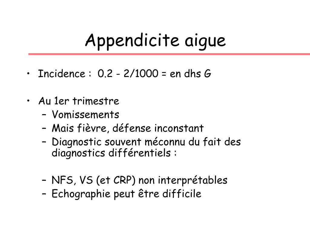 Appendicite aigue • Incidence : 0.2 - 2/1000 = en dhs G • Au 1er trimestre • Vomissements • Mais fièvre, défense inconstant • Diagnostic souvent méconnu du fait des diagnostics différentiels : • NFS, VS (et CRP) non interprétables • Echographie peut être difficile