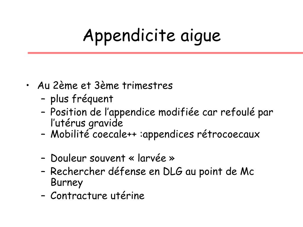 Appendicite aigue • Au 2ème et 3ème trimestres • plus fréquent • Position de l’appendice modifiée car refoulé par l’utérus gravide • Mobilité coecale++ :appendices rétrocoecaux • Douleur souvent « larvée » • Rechercher défense en DLG au point de Mc Burney • Contracture utérine