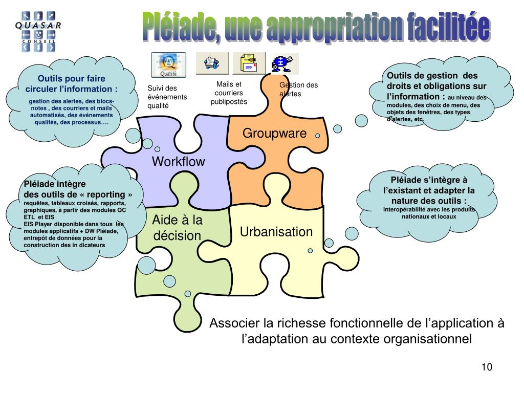 Pléiade, une appropriation facilitée Outils de gestion des droits et obligations sur l’information : au niveau des modules, des choix de menu, des objets des fenêtres, des types d’alertes, etc. Outils pour faire circuler l’information : gestion des alertes, des blocs-notes , des courriers et mails automatisés, des événements qualités, des processus…. Mails et courriers publipostés Gestion des alertes Suivi des événements qualité Groupware Workflow Pléiade s’intègre à l’existant et adapter la nature des outils : interopérabilité avec les produits nationaux et locaux Pléiade intègre des outils de « reporting » requêtes, tableaux croisés, rapports, graphiques, à partir des modules QC ETL et EISEIS Player disponible dans tous les modules applicatifs + DW Pléiade, entrepôt de données pour la construction des in dicateurs Aide à la décision Urbanisation Associer la richesse fonctionnelle de l’application à l’adaptation au contexte organisationnel