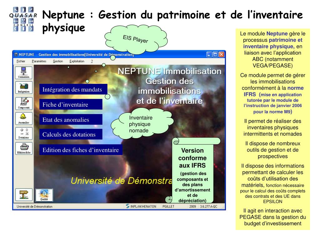 Neptune : Gestion du patrimoine et de l’inventaire physique Le module Neptune gère le processus patrimoine et inventaire physique, en liaison avec l’application ABC (notamment VEGA/PEGASE) Ce module permet de gérer les immobilisations conformément à la norme IFRS (mise en application tutorée par le module de l’instruction de janvier 2006 pour la norme M9) Il permet de réaliser des inventaires physiques intermittents et nomades Il dispose de nombreux outils de gestion et de prospectives Il dispose des informations permettant de calculer les coûts d’utilisation des matériels, fonction nécessaire pour le calcul des coûts complets des contrats et des UE dans EPSILON Il agit en interaction avec PEGASE dans la gestion du budget d’investissement EIS Player Intégration des mandats Fiche d’inventaire Inventaire physique nomade Etat des anomalies Calculs des dotations Edition des fiches d’inventaire Version conforme aux IFRS (gestion des composants et des plans d’amortissement et de dépréciation)