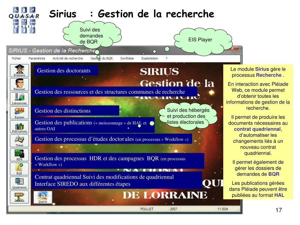 Sirius : Gestion de la recherche Suivi des demandes de BQR EIS Player Le module Sirius gère le processus Recherche . En interaction avec Pléiade Web, ce module permet d’obtenir toutes les informations de gestion de la recherche. Il permet de produire les documents nécessaires au contrat quadriennal, d’automatiser les changements liés à un nouveau contrat quadriennal. Il permet également de gérer les dossiers de demandes de BQR Les publications gérées dans Pléiade peuvent être publiées au format HAL Gestion des doctorants Gestion des ressources et des structures communes de recherche Gestion des distinctions Suivi des hébergés et production des listes électorales Gestion des publications (« moissonnage » de HAL et autres OAI Gestion des processus d’études doctor ales (en processus « Workflow ») Gestion des processus HDR et des campagnes BQR (en processus « Workflow ») Contrat quadriennal Suivi des modifications de quadriennalInterface SIREDO aux différentes étapes