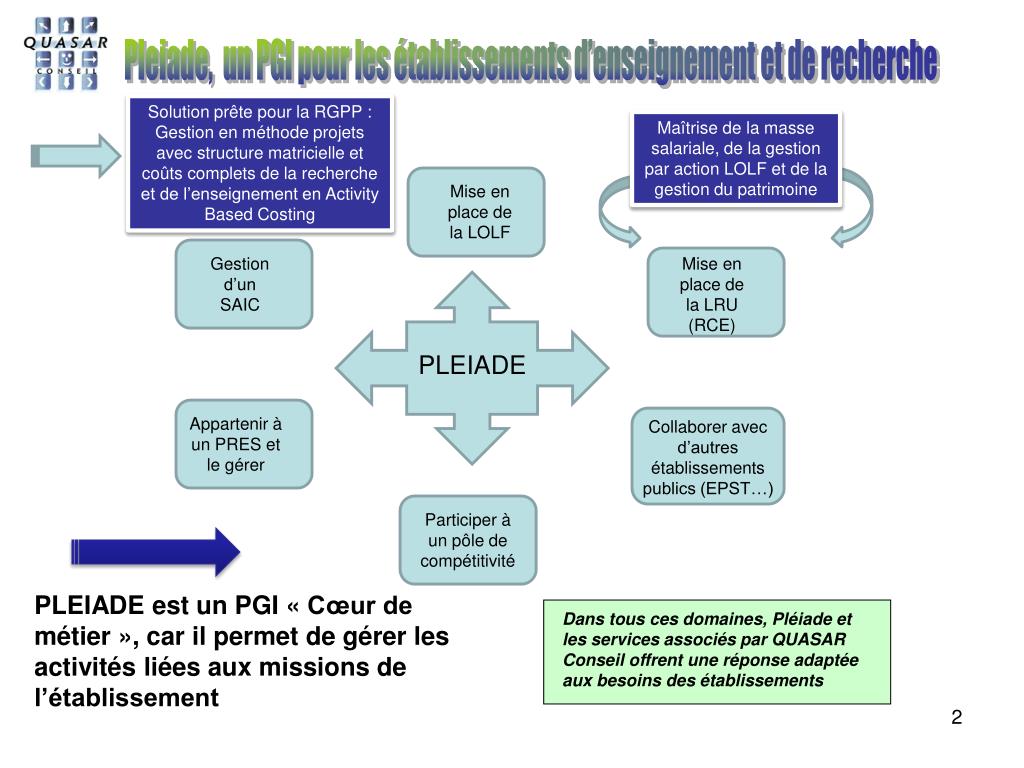 Pleiade, un PGI pour les établissements d’enseignement et de recherche Solution prête pour la RGPP : Gestion en méthode projets avec structure matricielle et coûts complets de la recherche et de l’enseignement en ActivityBasedCosting Maîtrise de la masse salariale, de la gestion par action LOLF et de la gestion du patrimoine Mise en place de la LOLF Gestion d’un SAIC Mise en place de la LRU (RCE) PLEIADE Appartenir à un PRES et le gérer Collaborer avec d’autres établissements publics (EPST…) Participer à un pôle de compétitivité PLEIADE est un PGI « Cœur de métier », car il permet de gérer les activités liées aux missions de l’établissement Dans tous ces domaines, Pléiade et les services associés par QUASAR Conseil offrent une réponse adaptée aux besoins des établissements