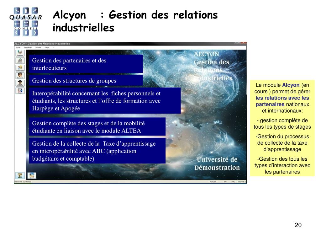 Alcyon : Gestion des relations industrielles Gestion des partenaires et des interlocuteurs Gestion des structures de groupes • Le module Alcyon (en cours )permet de gérer les relations avec les partenaires nationaux et internationaux: • gestion complète de tous les types de stages • Gestion du processus de collecte de la taxe d’apprentissage • Gestion des tous les types d’interaction avec les partenaires Interopérabilité concernant les fiches personnels et étudiants, les structures et l’offre de formation avec Harpège et Apogée Gestion complète des stages et de la mobilité étudiante en liaison avec le module ALTEA Gestion de la collecte de la Taxe d’apprentissage en interopérabilité avec ABC (application budgétaire et comptable)