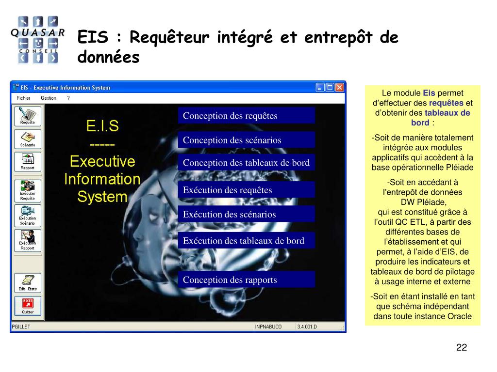 EIS : Requêteur intégré et entrepôt de données • Le module Eis permet d’effectuer des requêtes et d’obtenir des tableaux de bord : • Soit de manière totalement intégrée aux modules applicatifs qui accèdent à la base opérationnelle Pléiade • Soit en accédant à l’entrepôt de données DW Pléiade,qui est constitué grâce à l’outil QC ETL, à partir des différentes bases de l’établissement et qui permet, à l’aide d’EIS, de produire les indicateurs et tableaux de bord de pilotage à usage interne et externe • Soit en étant installé en tant que schéma indépendant dans toute instance Oracle Conception des requêtes Conception des scénarios Conception des tableaux de bord Exécution des requêtes Exécution des scénarios Exécution des tableaux de bord Conception des rapports