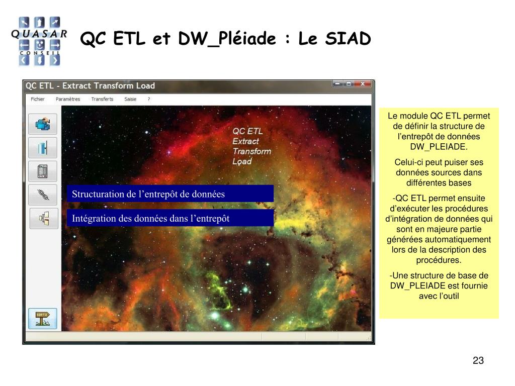 QC ETL et DW_Pléiade : Le SIAD • Le module QC ETL permet de définir la structure de l’entrepôt de données DW_PLEIADE. • Celui-ci peut puiser ses données sources dans différentes bases • QC ETL permet ensuite d’exécuter les procédures d’intégration de données qui sont en majeure partie générées automatiquement lors de la description des procédures. • Une structure de base de DW_PLEIADE est fournie avec l’outil Structuration de l’entrepôt de données Intégration des données dans l’entrepôt