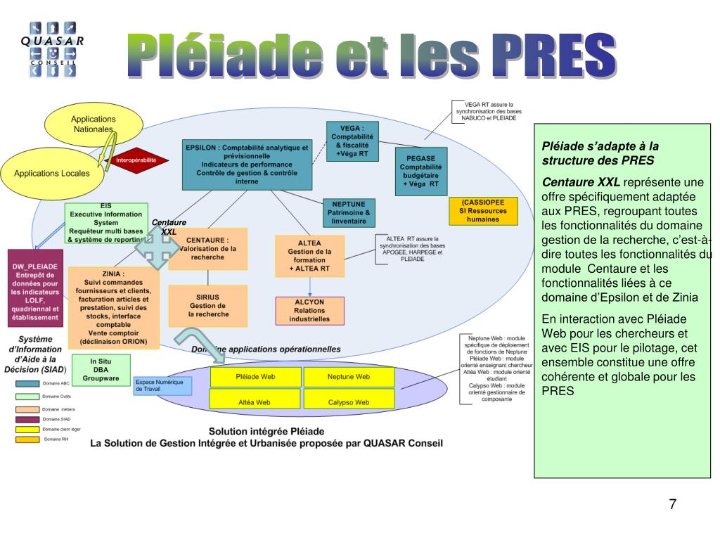 Pléiade et les PRES Pléiade s’adapte à la structure des PRES Centaure XXL représente une offre spécifiquement adaptée aux PRES, regroupant toutes les fonctionnalités du domaine gestion de la recherche, c’est-à-dire toutes les fonctionnalités du module Centaure et les fonctionnalités liées à ce domaine d’Epsilon et de Zinia En interaction avec Pléiade Web pour les chercheurs et avec EIS pour le pilotage, cet ensemble constitue une offre cohérente et globale pour les PRES Centaure XXL